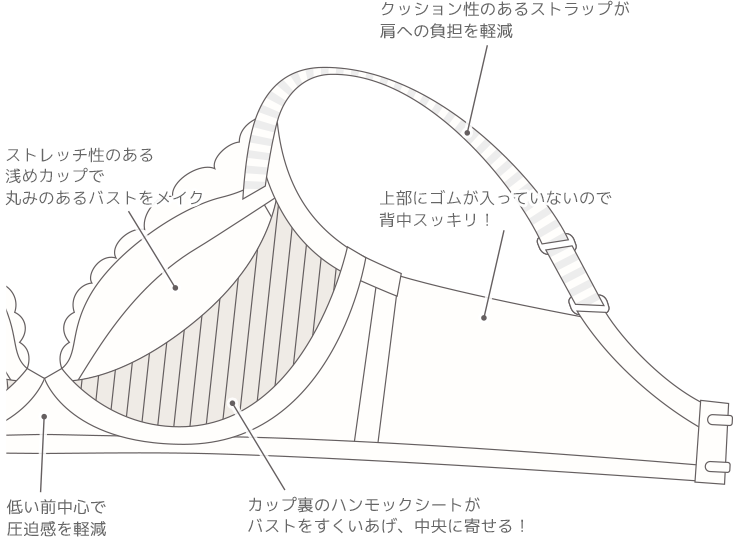 ハンモックシートがバストをすくい上げて中央に寄せるから、自然にトップ位置がアップ&谷間をキープ!