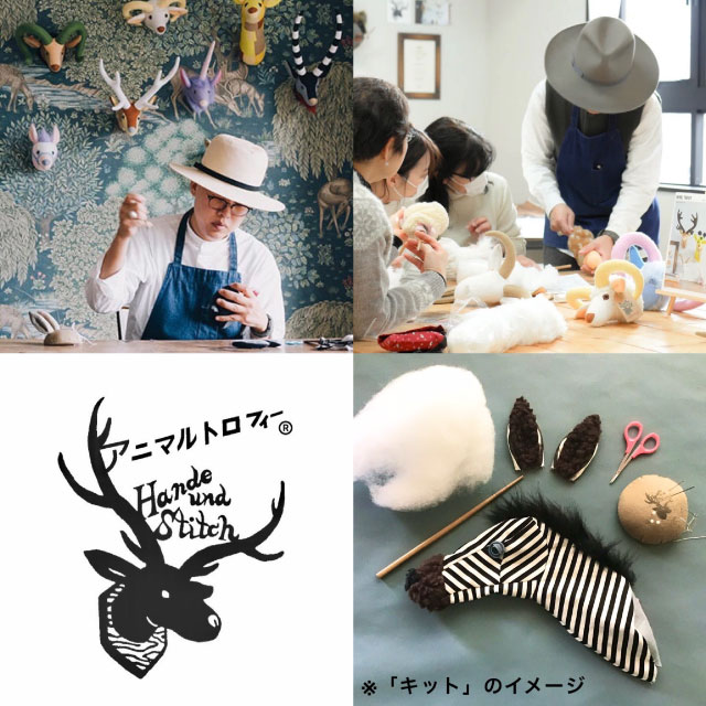 ●講師紹介 花村一晃 『アニマルトロフィー』作家・花村一晃(ハナムラカズアキ) 1981年岐阜県大垣市出身。 大阪芸術大学工芸学科テキスタイルデザインコース、文化服装学院二部服装科(夜間)を卒業。 衣装製作、アパレルメーカーを経て渡独。ドイツ(ハンブルグ)に滞在中に古いシュタイフのぬいぐるみ・ハンティングトロフィーにインスピレーションを受け、日本から持ってきた着物の古市で「アニマルトロフィー」の「シカ」を作ったのが始まり。 2011年帰国後、自身のブランド”Hande und Stitch”(ハンド ウンド ステッチ)を立ち上げる。 『minneハンドメイド大賞2017』グランプリ受賞。著書本『フェルトでつくるアニマルトロフィー』(誠文堂新光社)発売中。各地で「ワークショップ」や「ポップアップ」を開催し、岐阜県にアトリエを構え活動を続けている。 ▼SNSアカウント