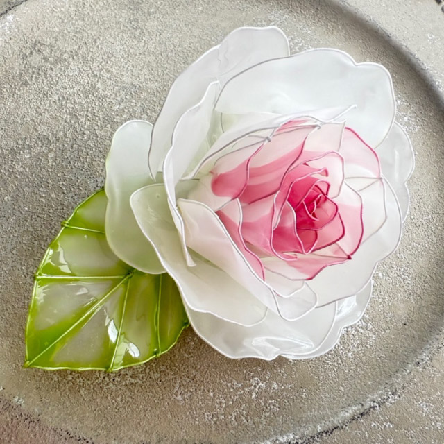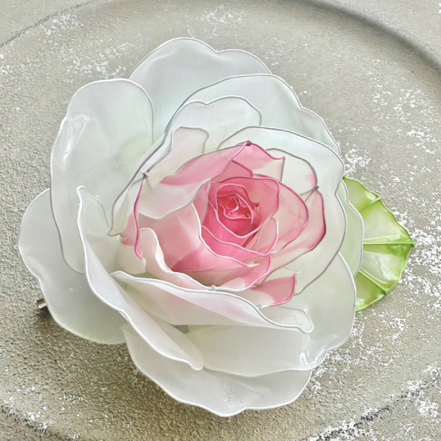 ガラスのような透け感のあるアメリカンフラワーをトウペディップアート協会の専門の先生から学ぶワークショップです。 中心がピンク、外側に向けて白のグラデーションが印象的な柔らかいバラを作ります。 ※ブローチかコームをお選びいただけます(申し込み時にお選び下さい。変更は出来ません)