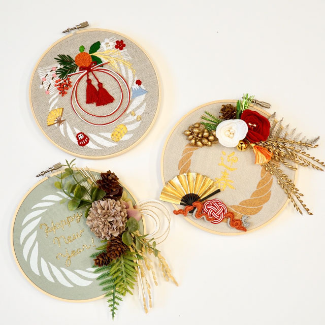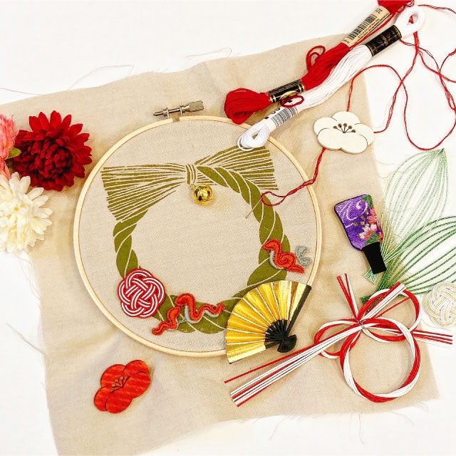 新年を迎える準備! あらかじめ、しめ縄の柄をプリントしてあるリース生地にお好みの刺繍や加飾をして 自分だけのオリジナルしめ縄リースを作るワークショップです。 使用するのは簡単なステッチなので初心者さんも大歓迎。 材料やお道具は全て準備してあります。手ぶらでご参加ください。 レースや装花、ビーズなど様々な素材をお使いいただけます。素材はビュッフェスタイルで自由にお選びいただけます。 刺繍枠ごと飾るデザインなので時間内に刺繍が終わらなくてもご自宅で続きをお楽しみいただけます。