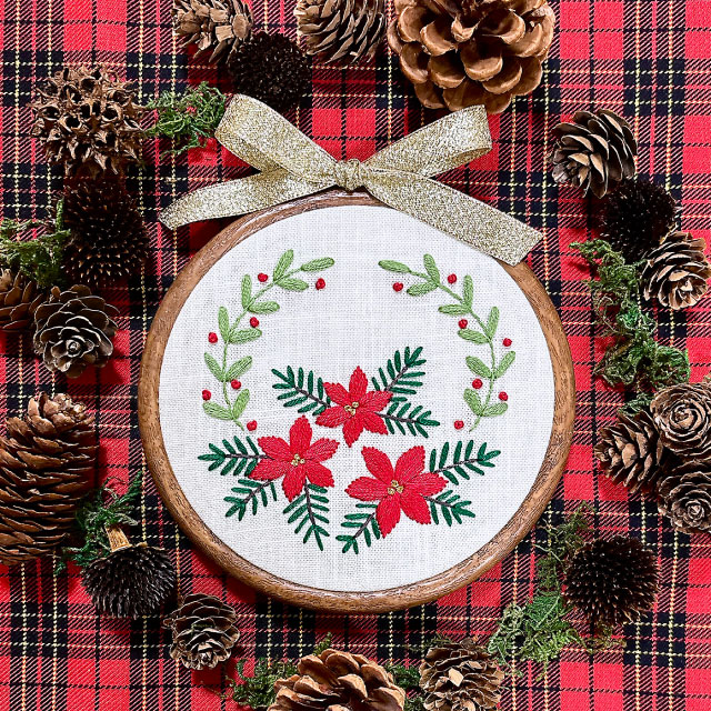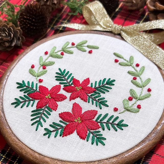 ポインセチアの花を刺繍してクリスマスの額を仕上げます。 外サイズ約14×14㎝のフープ(壁掛けタイプ)を刺繍枠として使用し、そのまま壁に飾れます。あらかじめ下絵が描いてありますのでお手軽に刺繍が始められます。 ご一緒に刺繍の時間、手づくりの楽しさを体験していただけたら嬉しいです。