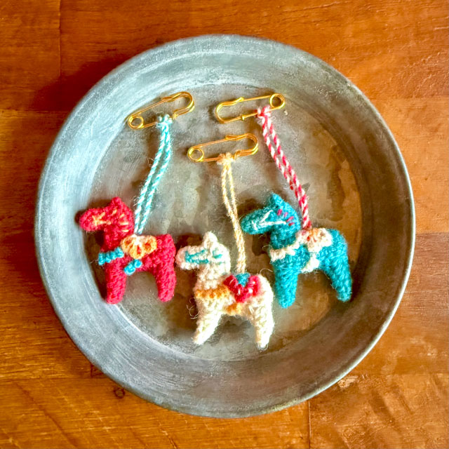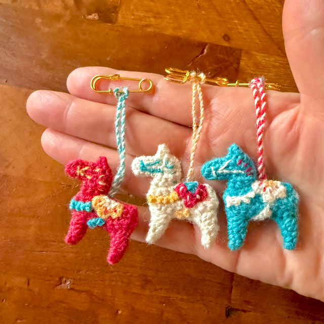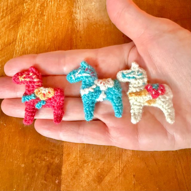 かぎ針経験者向けの講座となります。 レース針を使い、細編み、中長編みを編んで作品を作ります。 午年にちなみ、北欧の木彫りの馬、ダーラナホースを編んで作ります。 カラフルなデンマーク製の毛糸から、お好きな色を選んでいただき、作品を製作します。 レース針0~2号で本体を編み、本体の飾りは4号で編み縫い付けますので、細かい作業となります。 本体は顔から編み始め、一筆編みのように糸を続けて編みます。 2枚編んで、片方に編んで作ったモチーフを縫い付けてから、2枚をはぎ合わせて仕上げます。 はぎ合わせて作るために、とても小さな作品に仕上がります。 今までにない作品の工程を楽しんでいただければと思います。
