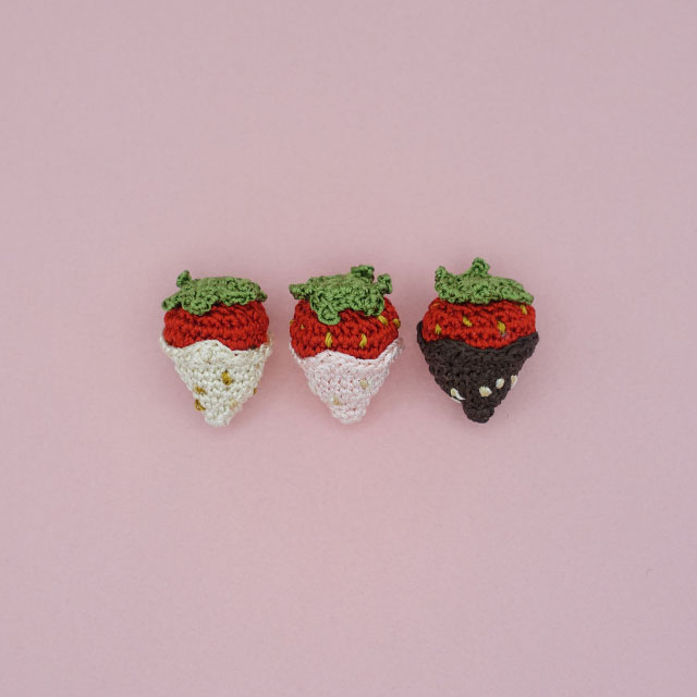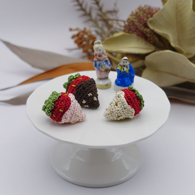 バレンタインに向けて、実物大でかわいい「いちごチョコレートフォンデュ」はいかがでしょうか。 材料には、色と光沢が美しい京都西陣の絹糸を使い、レース用かぎ針で編みます。 チョコレートの色は、チョコ(茶色)、ホワイト(白色)、ストロベリー(薄いピンク色)からお選びいただけます。 ご予約時にお選びください。 仕上がった作品は、ブローチまたはキーホルダーに仕立てることができます(ブローチまたはキーホルダーは、当日お選びいただきます)。 ※チョコレートの色は、明るい色の糸の方が編み目が見やすくて編みやすいです。 ※レース用かぎ針で、レース糸#20~#40相当の細さの絹糸を編んでいただきます。 そのため、かぎ針編み経験のある方の参加をお勧めします。 ※時間内に終わらなかった場合は、途中でお持ち帰りいただきます。