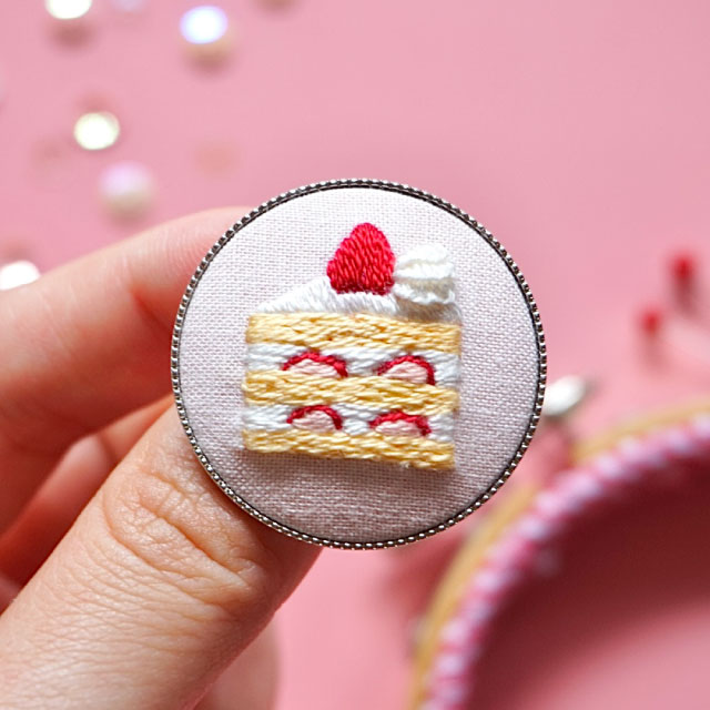 ショートケーキのモチーフを刺繍し、ブローチに仕立てます。 刺繍初心者さんでも対面で詳しくお教えしますので安心して参加していただけます。 手刺繍の基本的なステッチが学べて他のモチーフにも応用できます! 仕上がりサイズは3×3cmです