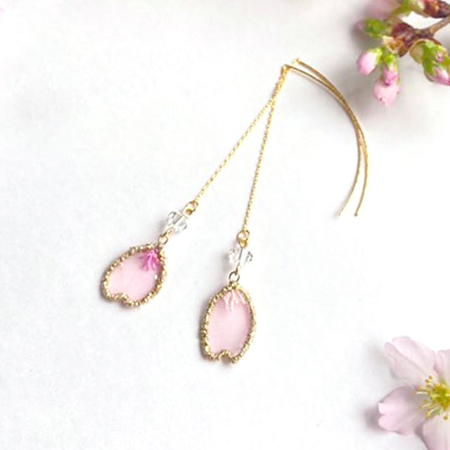 ワイヤーを縫い込んで立体に仕上げることができるスタンプワークの技法を使って、小さな桜の花びらを作ります。 オーガンジーの透け感が軽やかで、薄いピンク色が春らしいデザインです。 ピアス・アイリングお好みのお仕立てをお選びいただきます。 図案写しから布の張り方、ワイヤーワーク、裏面も美しいステッチ、立体刺繍のアクセサリーの仕上げまで、工程を全て学べます。