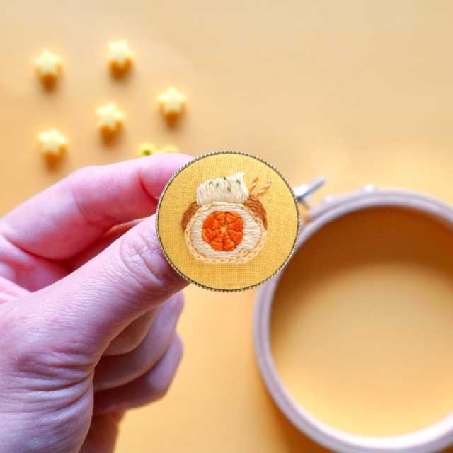 オレンジロールケーキのモチーフを刺繍し、ブローチに仕立てます。 刺繍初心者さんでも対面で詳しくお教えしますので安心して参加していただけます。 手刺繍の基本的なステッチが学べて他のモチーフにも応用できます! 仕上がりサイズは3cm×3cmです