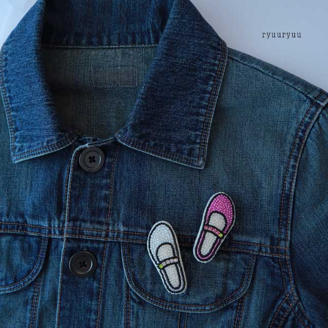 ストラップシューズモチーフのブローチです。 左右どちらか片方のブローチを1点作ります。 あらかじめ図案がプリントされた布に刺繍をしていただきます。 ワークショップでは見本以外のお色を選んでいただくこともできます。 (選べる色は当日のお楽しみです。) 手刺繍によるビーズの縫い方などが学べます。 ブローチに仕立てる縫い方も学べます。 (流流独自の手法が含まれることもあります) サイズ:縦:約6cm 横:約2.5cm