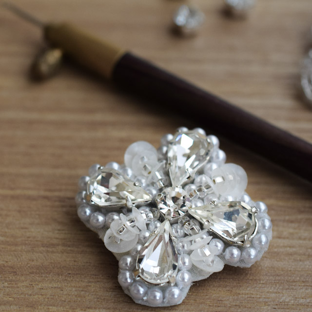 リュネビル刺繍を体験していただける、小さなブローチ作りのワークショップです。 リュネビル刺繍の基本技法を練習しながら、上品なきらめきを添えたブローチを制作します。 授業内で仕立てまで行い、完成品をお持ち帰りいただける予定です。(進行状況により、講師が手助けいたします。) 初心者の方も安心してご参加いただけます。 必要な道具類はすべてこちらでご用意いたしますので、どうぞお気軽にお越しください。 リュネビル刺繍にご興味のある方、はじめるきっかけを探している方、独学中で基礎に不安を感じていらっしゃる方などに、おすすめの内容です。