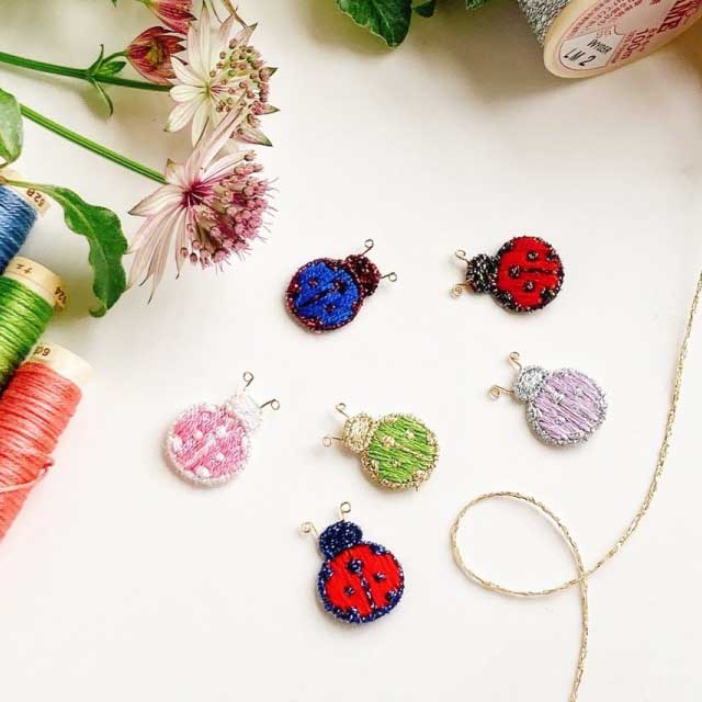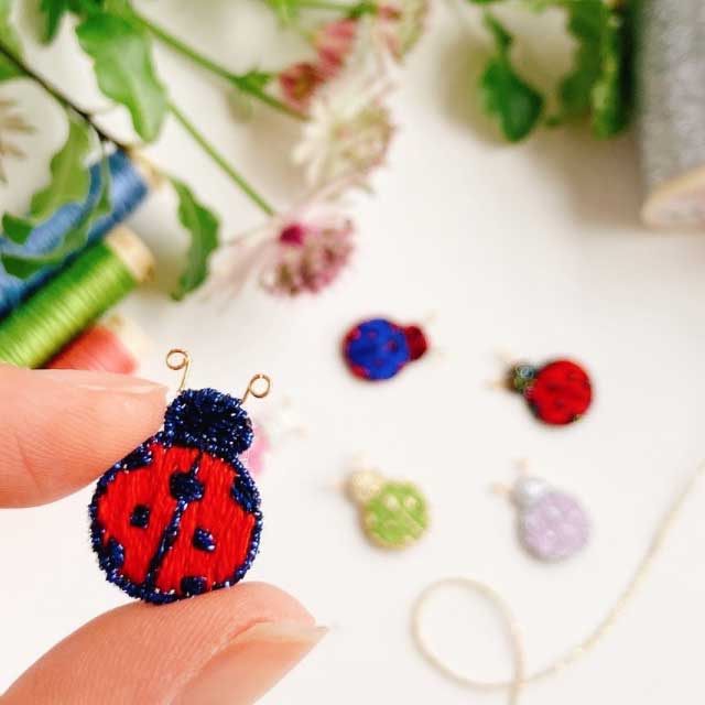 立体刺繍の技法を使って、小さなてんとう虫のブローチを作ります。 お好みのカラーの刺繍糸を自由にお選びいただけます。 材料やお道具は全て準備済みです。手ぶらでお越しください。 刺繍初心者の方も大歓迎!図案の写し方、ワイヤーワーク、基礎のステッチ等、全てレッスンします。 てんとう虫サイズ約15mm