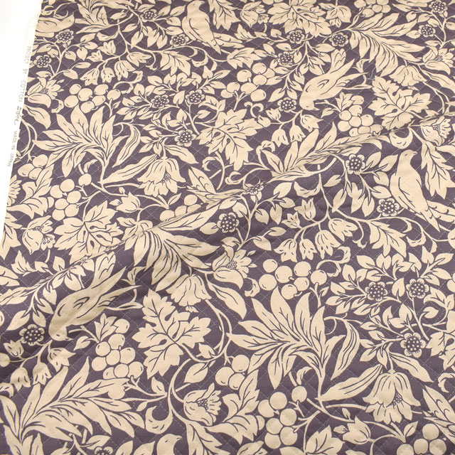 表布に程よい厚みのあるツイル生地を使用し、大人っぽく落ち着いた雰囲気のお花・木の実・小鳥がプリントされたキルト生地です。