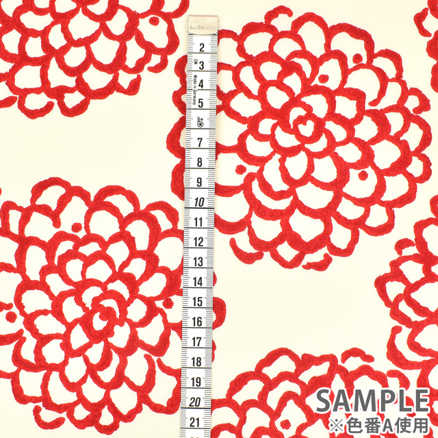 手書き風の大きなダリア柄がプリントされたコットン素材のツイル生地です。