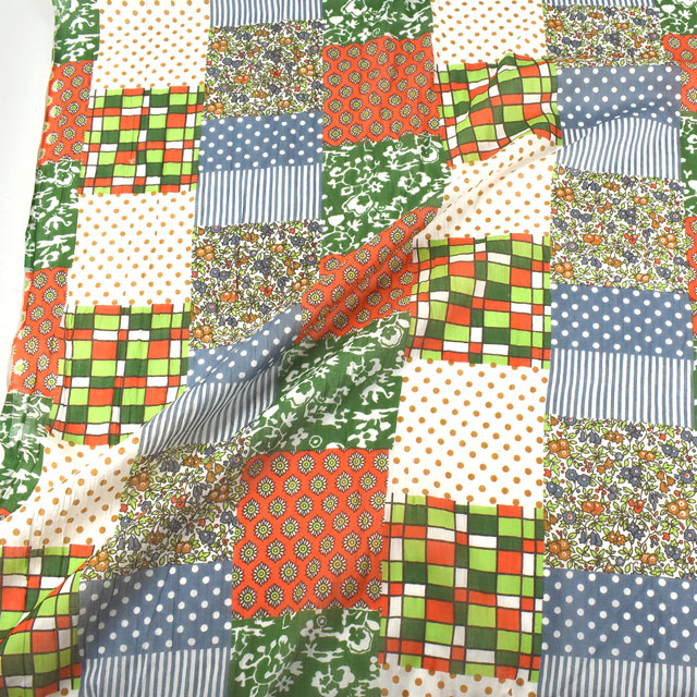 水玉やチェック・花柄・小紋柄などが組み合わされたパッチワーク調のデザインです。