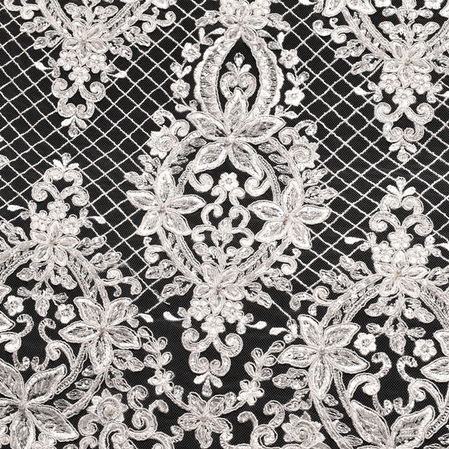 生地全面に格子柄の刺繍が施されており、花やツタの刺繍の上にビーズ、パール、スパンコールが縫い付けられている豪華なビーズ刺繍レース。
