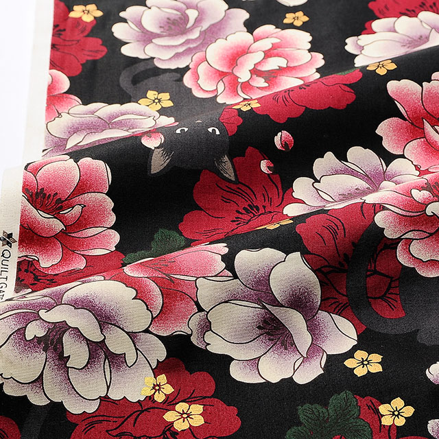 華やかで艶やかな「和」を基調とした、百花繚蘭シリーズ「黒猫と牡丹」柄のプリント生地です。