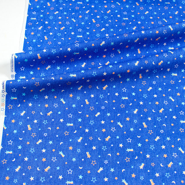 デニム風のプリント生地にラメの星柄がプリントされた生地です。