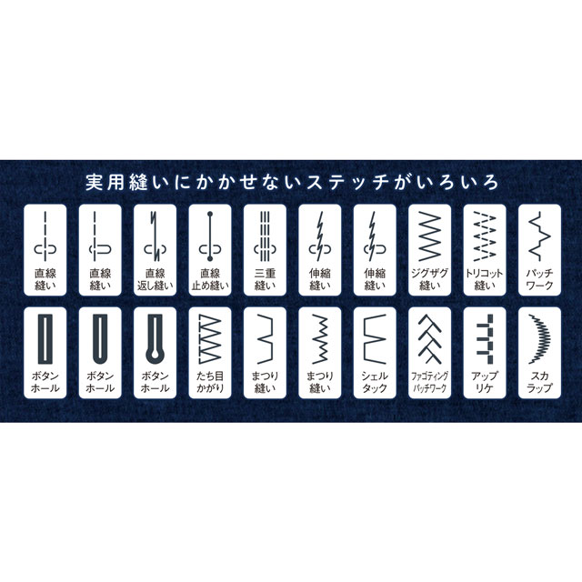 ●ミシン付属品:基本押え、たち目かがり押え、ファスナー押え、サテン押え、まつり縫い押え、ボタンホール押え、シームリッパー、補助糸立て棒、ボビン4個、糸こま受け台、フェルト、ミシンブラシ、針セット、ドライバー、糸こま押え(大・小)、取扱説明書、電源コード、説明DVD、ハードケース