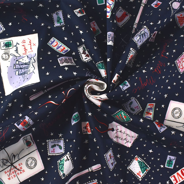 リバティのデザインスタジオでホリデーシーズン用に特別に描かれた、お祝いの切手や大切な人へ送る手紙が散りばめられたデザインです。
