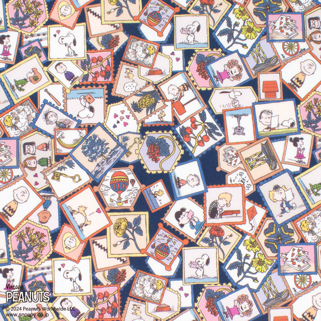 楽しい切手のコレクションの遊び心溢れるこのデザインは、手描きのリバティ・ファブリックスパターンとピーナッツのなかまたちがシームレスに融合し、物語の魅力を呼び起こします。