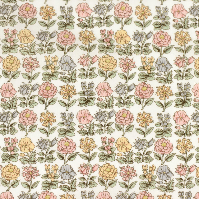 1990年代初頭にリバティのテキスタイル・デザイン・スタジオを率いていたプル・ロスクローの指揮のもとに制作されたボタニカルデザインで、丹念に手入れされた庭園の精密さを思わせる端正に整えられたデザインです。