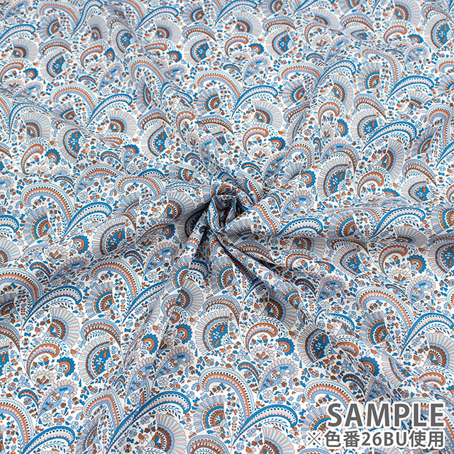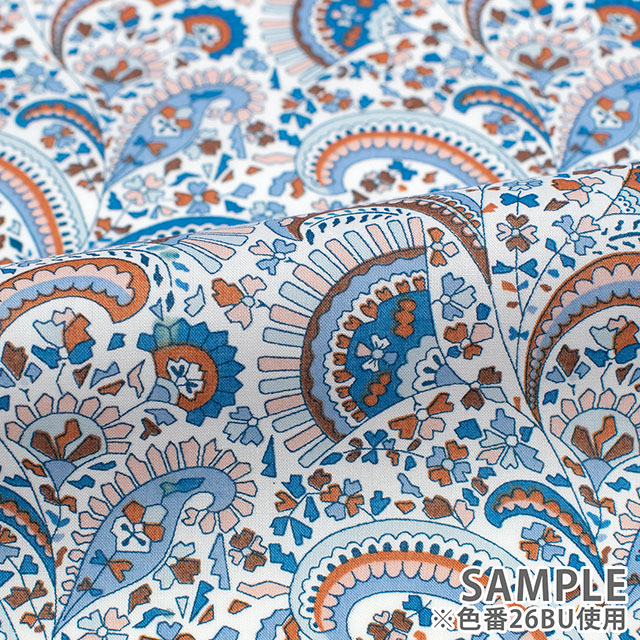 リバティのデザインスタジオにて細いラインペンで繊細に再描画されたこのプリントは、さまざまなペイズリー・フラワーの要素を組み合わせ、喜びと祝祭感を感じさせるファンファーレのような背景を作り出しています。