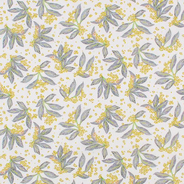 リバティのスタジオで手描きされたこのデザインは、多方向に構成された葉の流れと、きらめくように描かれたワスレナグサが印象的です。