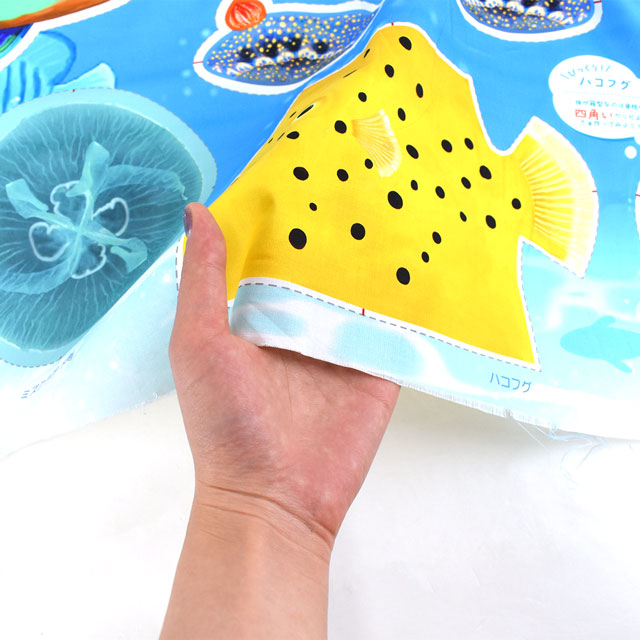 モチーフを切って縫い合わせると、お魚や海の生き物たちの立体的でリアルな作品が作れます。(生地に作り方がプリントされています。)