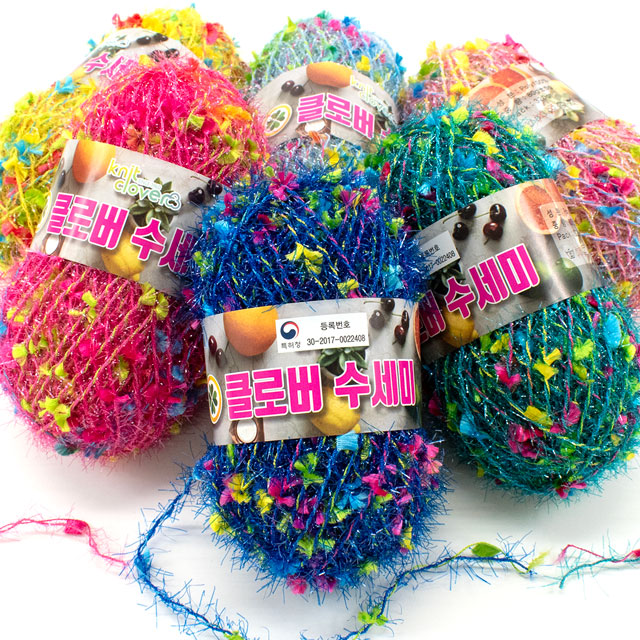 韓国から輸入したブラッシュヤーンは、たわしにも使えるキラキラした手編み糸です。