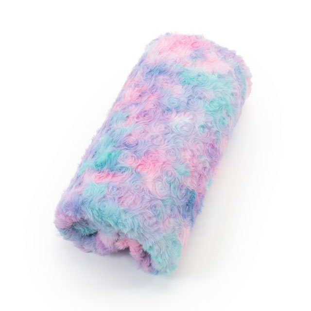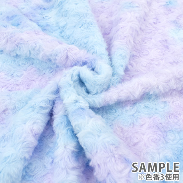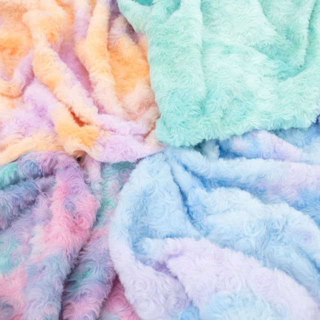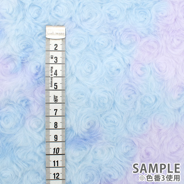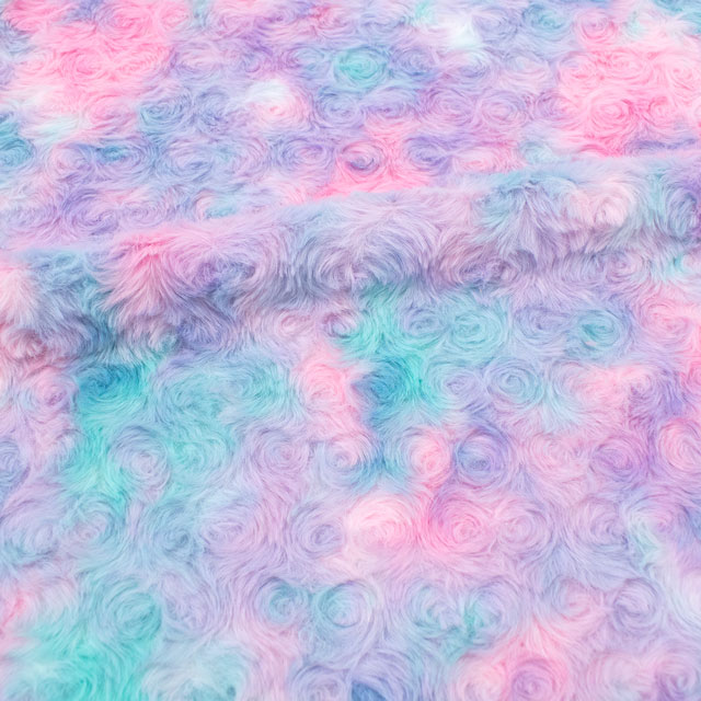 バラの花のようにくるくると毛並みが巻かれた、ふわふわの手触りのフェイクファー生地です。
