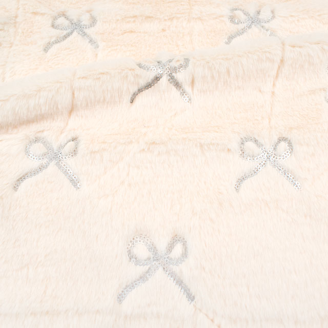 スパンコールで描かれたリボン柄がかわいい、柔らかくラビットファーのような手触りの片面ボア生地です。