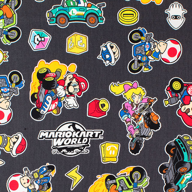 人気ゲーム、マリオカートワールドのプリント生地です。