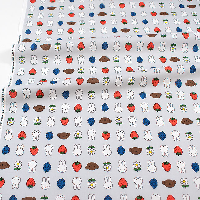 ミッフィーとフルーツやお花が並んだプリント生地です。
