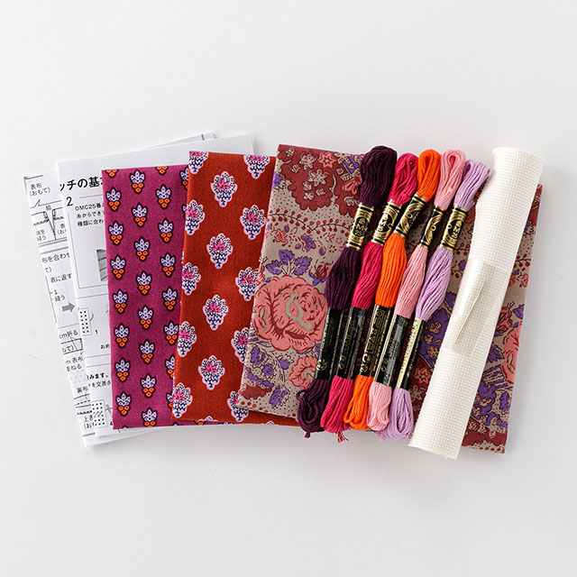 - ●セット内容:ソレイアード生地(55cm×27cm・3種)、アイーダ生地(18カウント・27cm×33cm)、DMC25番刺繍糸(5本)、刺繍針(24号・1本)、図案、レシピ