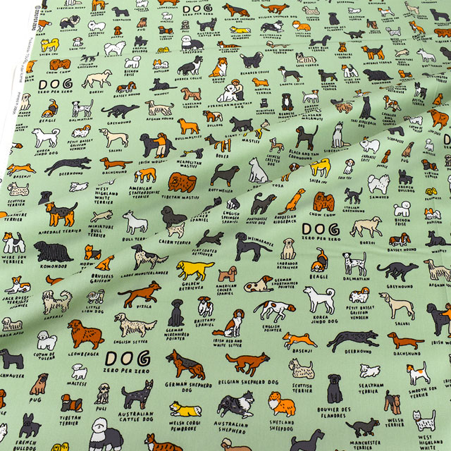 世界中の様々な犬のイラストと、英語の犬種名がデザインされた柄です。