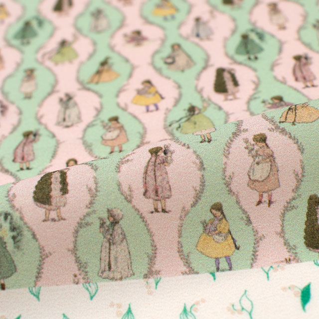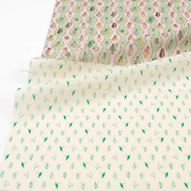 ミニチュアサイズに縮小した柄の生地とくらはしれいさんの描くお洋服の柄を再現した生地の2柄が1枚にプリントされています。