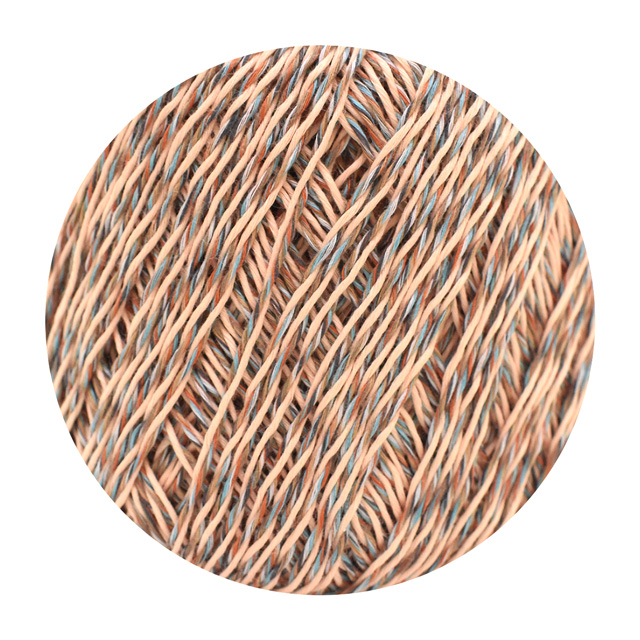 ベースカラー(1色18本撚り)と、アソートカラー・アクセントカラー(6色各3本撚り)の2つの撚り糸を甘撚りしたタイプで、サラっとしたソフトなタッチに仕上げています。