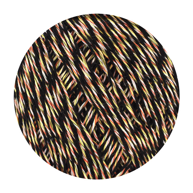 ベースカラー(1色18本撚り)と、アソートカラー・アクセントカラー(6色各3本撚り)の2つの撚り糸を甘撚りしたタイプで、サラっとしたソフトなタッチに仕上げています。