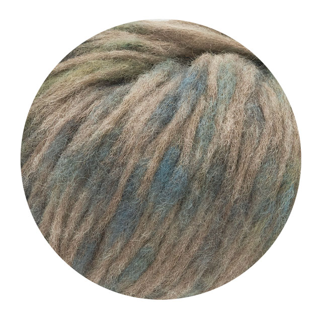 綿糸でリリヤーンを編みながら内部にウール・アルパカ混のスライバーを吹き込み、更に所々にプリント染めしたウールスライバーを吹き込んで太いスラブ状の部分を作られています。