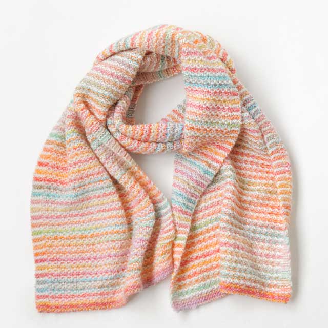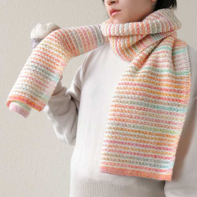 シンプルなデザインですが、交互に違う色の糸を入れることで、凝ったイメージのストールになります。