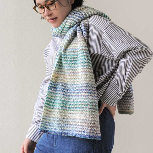 シンプルなデザインですが、交互に違う色の糸を入れることで、凝ったイメージのストールになります。