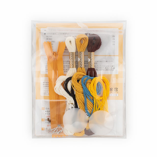 - ●セット内容:コスモ25番刺しゅう糸(綿100%)、ファスナー、ビーズ、包みボタン、ボールチェーン、作り方説明書