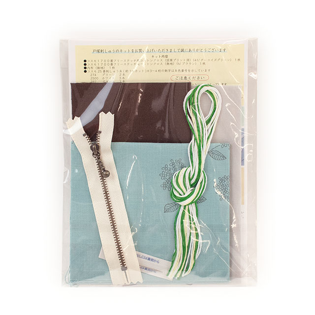 - ●セット内容:コスモ1700番フリーステッチ用コットンクロス(図案プリント済み)、内布(無地)、コスモ25番刺繍糸、ファスナー、刺しゅう針、実物大型紙、 図案付き作り方説明書