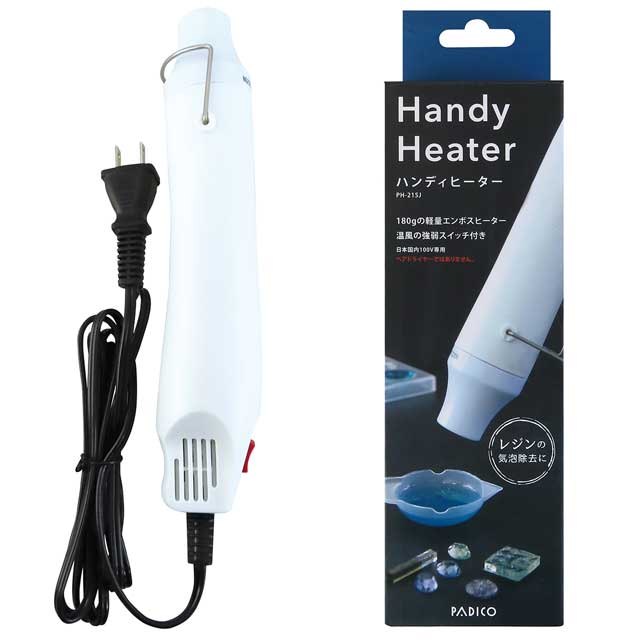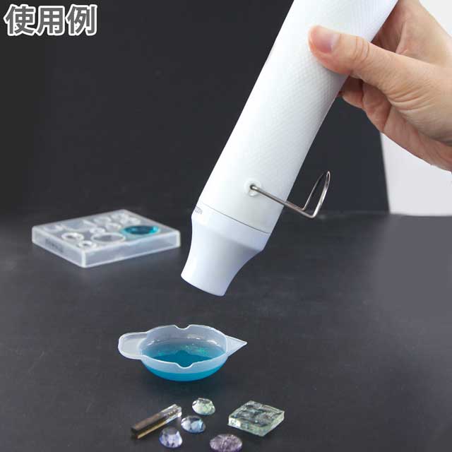 レジン液を低粘性化して気泡の除去、特殊樹脂(ライナーモールドなど)の加熱、スタンプのエンボス加工、インクのアートの模様作りに最適です。
