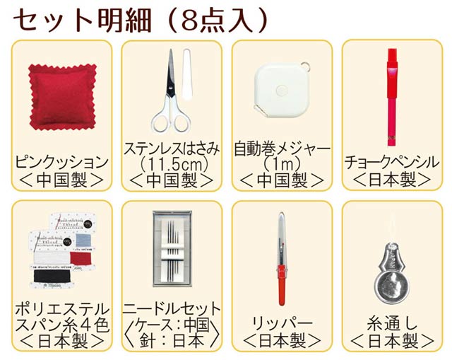 ●中身:ピンクッション、ステンレスはさみ(11.5cm)、自動巻メジャー(1m)、チョークペンシル、ポリエステルスパン糸4色、ニードルセット、リッパー、糸通し