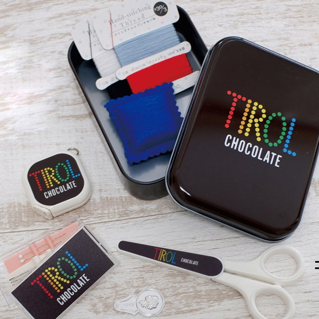 ブリキの缶に入った、チロルチョコのデザインのソーイングセットです。