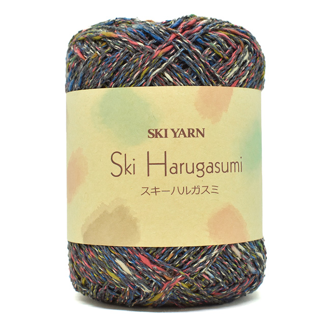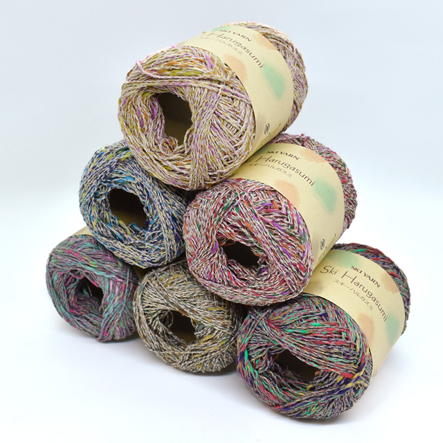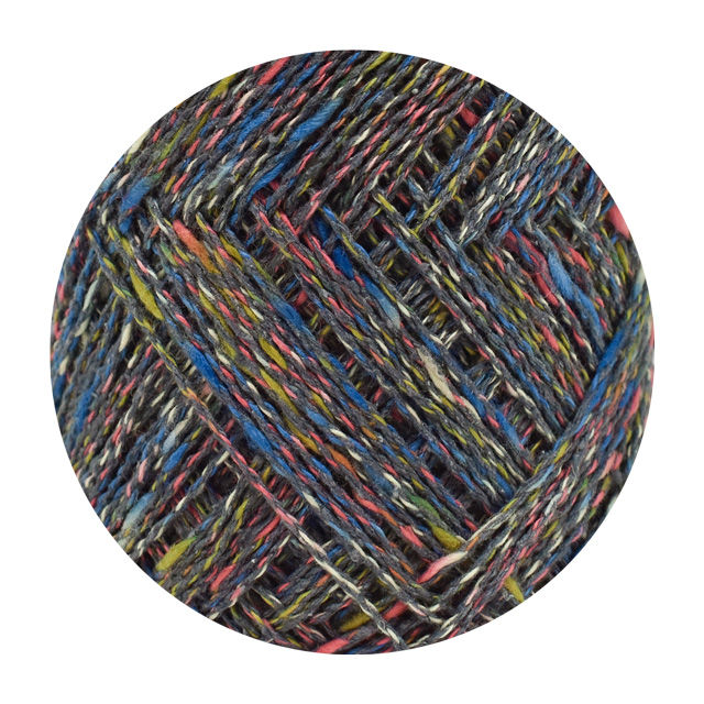 マットでさっくりしたナチュラルカラーのシルク糸と、綿素材のカラフルなスラブヤーンを撚ったファンシーヤーンです。