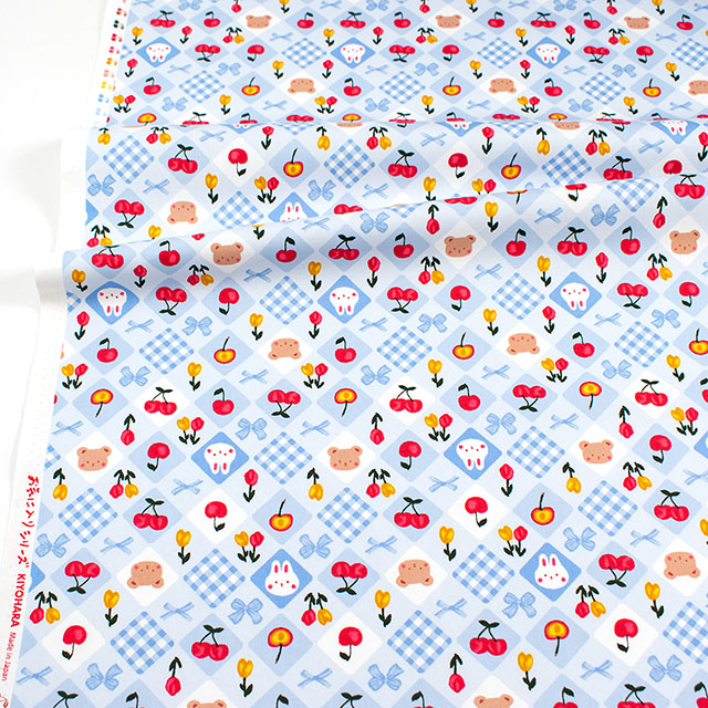 お子様が好きなうさぎやくまにさくらんぼ・チューリップがパッチワーク調にデザインされたプリント生地です。