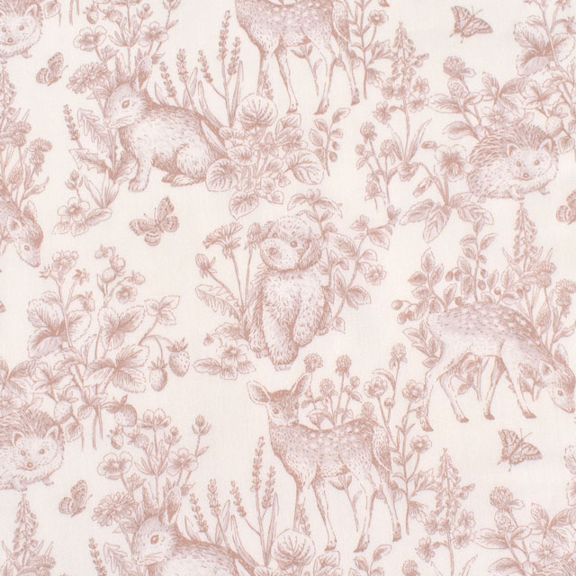 古典的なトワルドジュイのデザインの中に、うさぎやシカ、トイプードルなどのかわいい動物が描かれています。