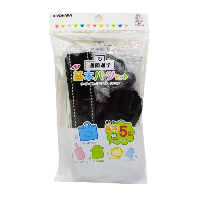 これひとつで通園通学に必要な基本アイテム5点(レッスンバッグ、シューズケース、体操着袋、お弁当袋、コップ袋)が作れます。