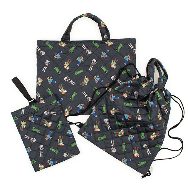 お子様に人気のマインクラフトのレッスンバッグ、シューズケース、ナップサックの三点セットです。