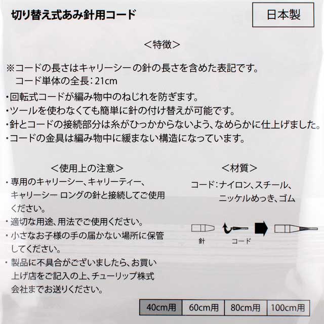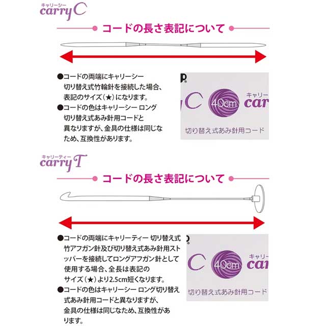 ※キャリーシーロング 切り替え式竹輪針(CCJA-29~39、CCJA-45~47)と接続できるが、全長は45㎝になり、輪編みにする場合は40cmコードは使用できません。
